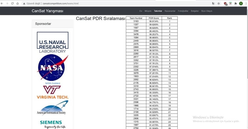 Model Uydu Takımımızın Amerika'da düzenlenen CanSat 2021 Model Uydu yarışmasında ilk aşama raporunda 98.8806 puan ile Dünya çapında 5. sırada yer aldık. Ülkemizi en iyi şekilde temsil etmeye devam edeceğiz