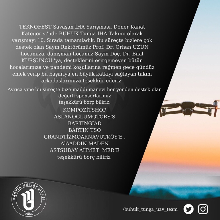 Teknofest İha yarışması döner kanat kategorisinde Türkiye 10.su olarak derece yapan @buhuk_tunga_uav_team takımımızı tebrik ediyoruz.